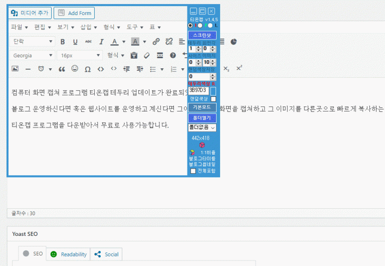 컴퓨터 화면 캡쳐 프로그램 티온캡 테두리 업데이트가 완료되었습니다. 블로그 운영하신다면 혹은 웹사이트를 운영하고 계신다면 그이외 컴퓨터 화면을 캡쳐하고 그 이미지를 다른곳으로 빠르게 복사하는 방법이 필요하다면 티온캡 프로그램을 다운받아서 무료로 사용가능합니다....